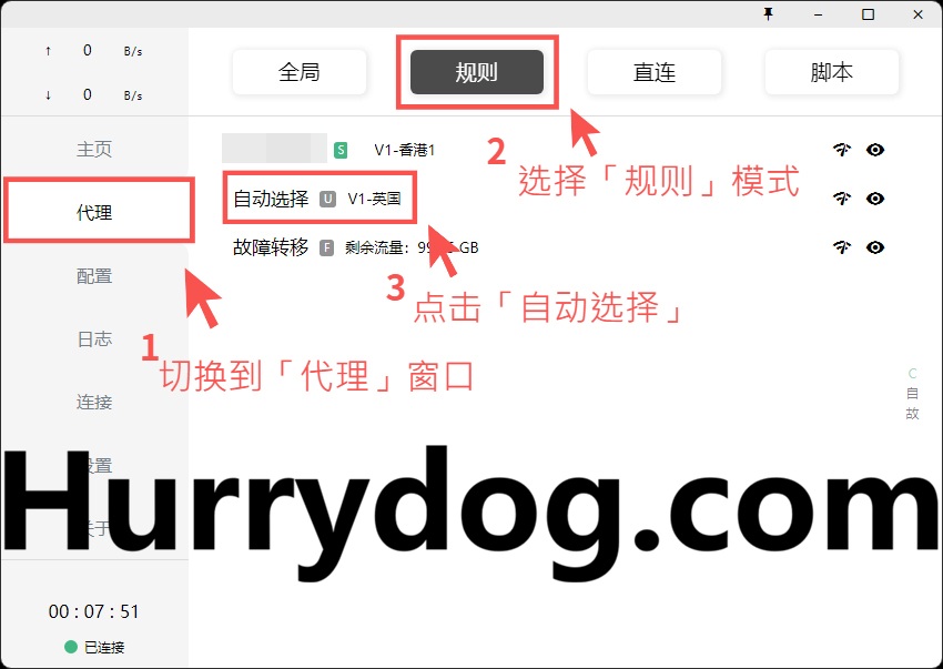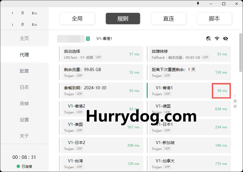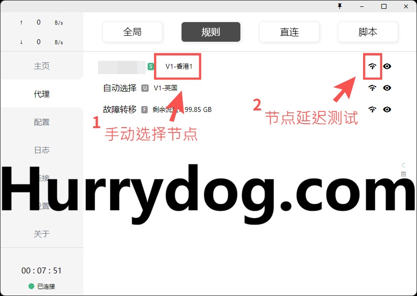 例如,我们选择了「规则模式」下的「自动选择」,自动分配了延迟最低的「V1-英国」节点。