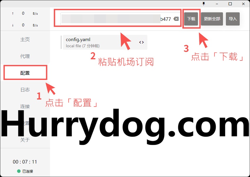 2. 打开 Clash for Windows,进入「配置」选项,然后将刚才从机场复制的订阅链接粘贴到指定区域。