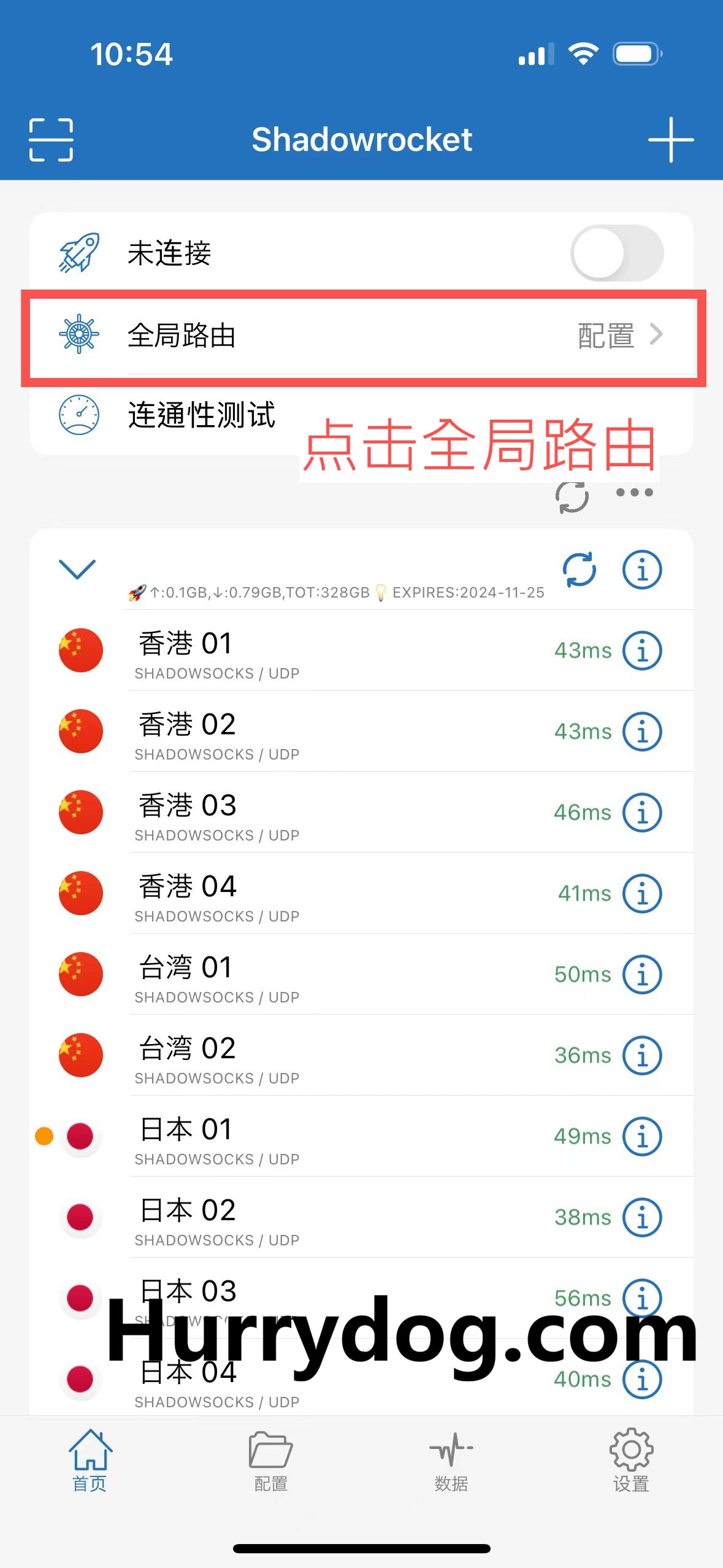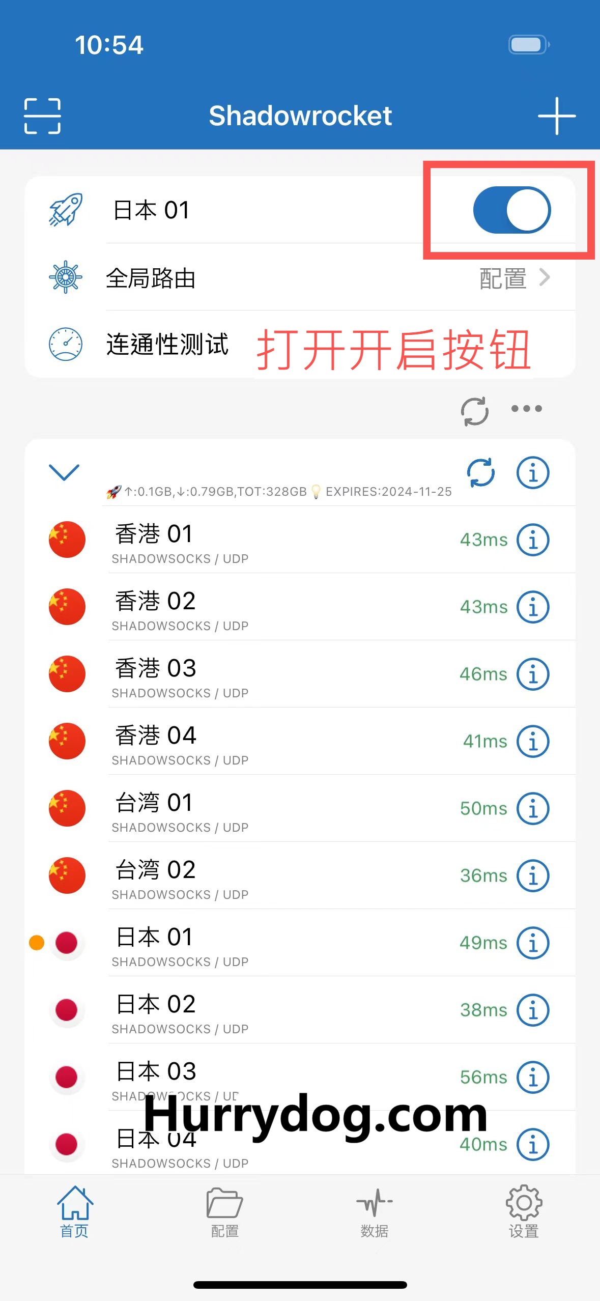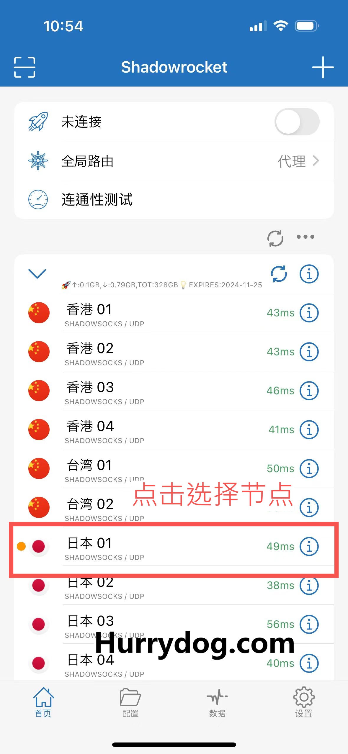 ※ 回到 Shadowrocket 首页,点击「连通性测试」来测速。选择延迟低、速度快的节点即可开始使用。选择一个节点后,点击链接按钮即可启动该节点。这将使您的网络流量通过所选代理进行传输,确保您能够顺利访问被限制的内容。