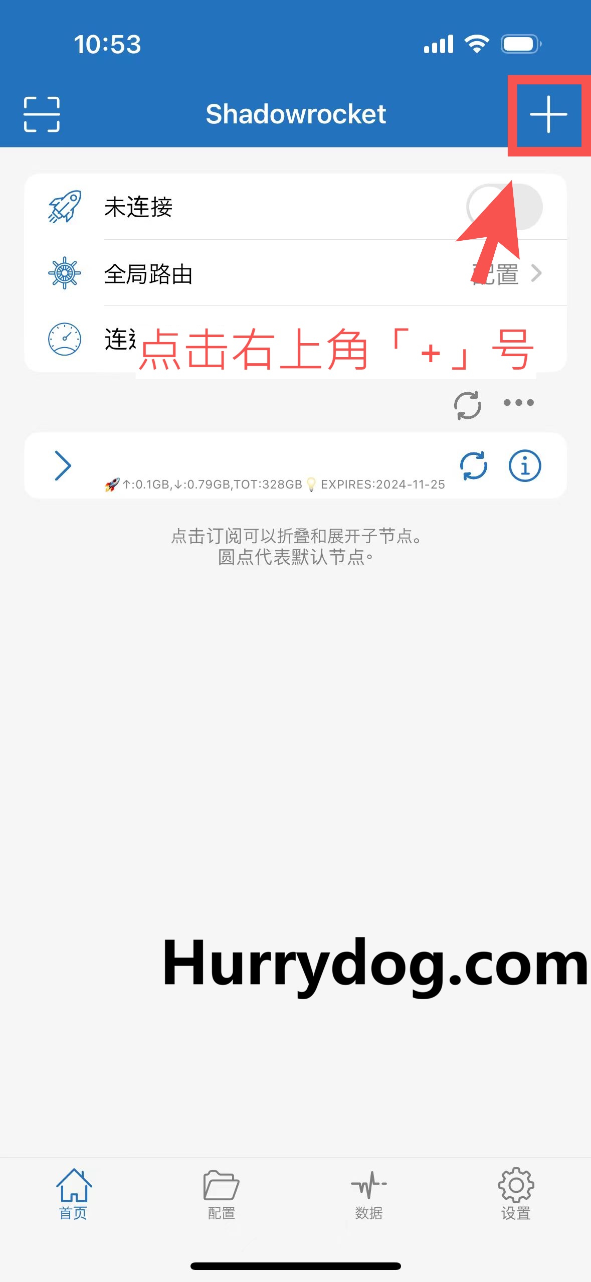 ※ 打开 Shadowrocket 客户端,点击右上角的【+】按钮,以添加新的配置。