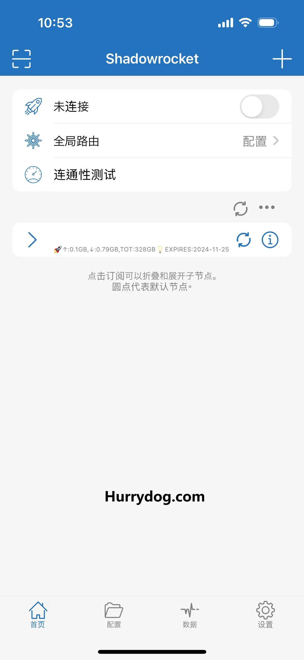 成功安装 Shadowrocket 后,打开应用时将看到默认页面。在此页面,您可以快速访问设置选项以及可用的代理节点,方便进行网络连接和管理。
