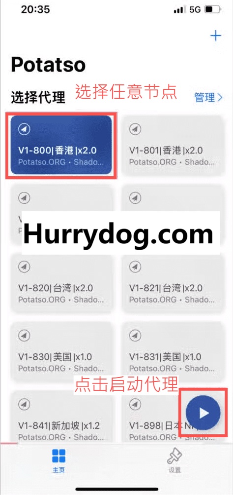 添加完节点后,您可以在主页上查看到所添加的服务器节点。选择任意一个节点后,点击右下角的播放图标即可启动代理。