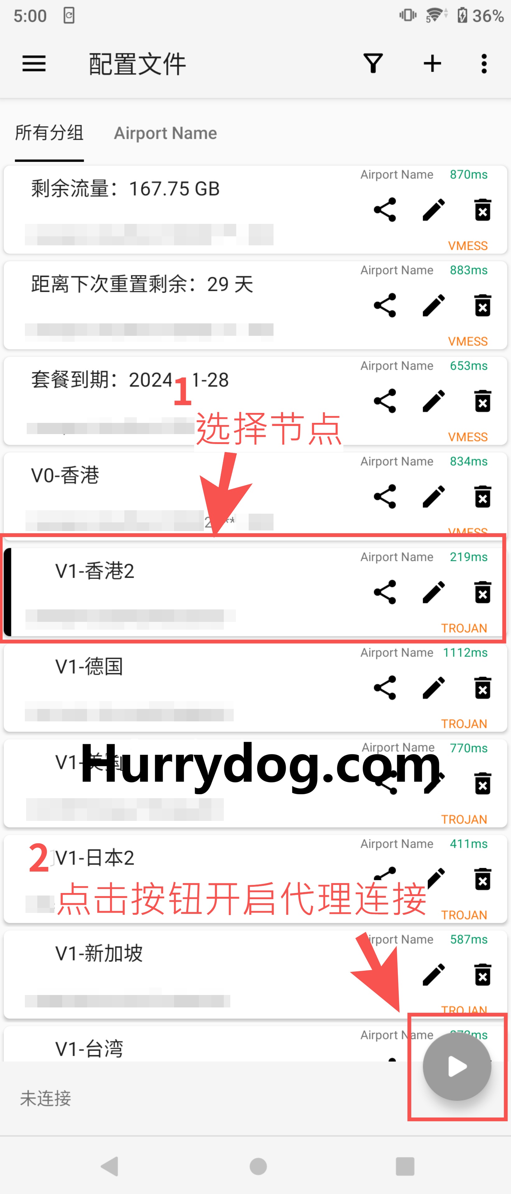 启用代理:选择一个节点,点击右下角按钮开启代理连接。