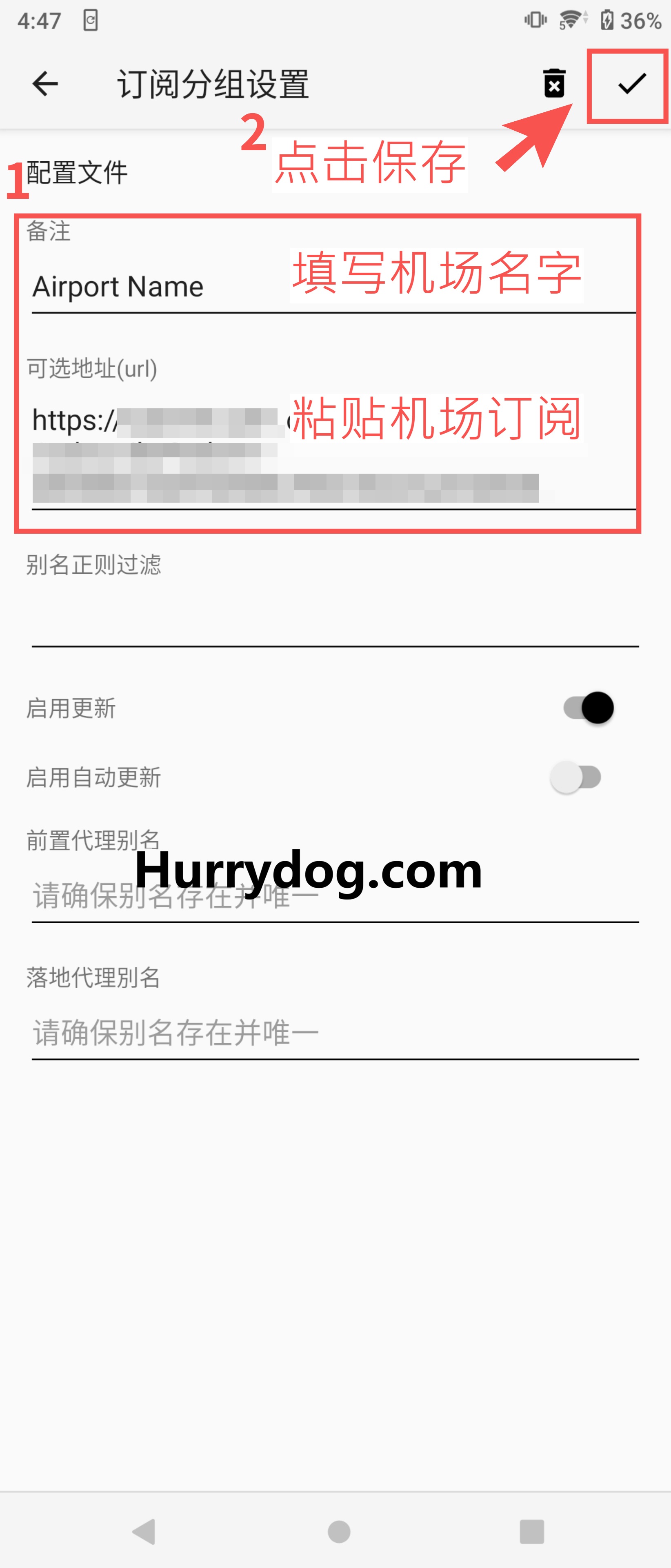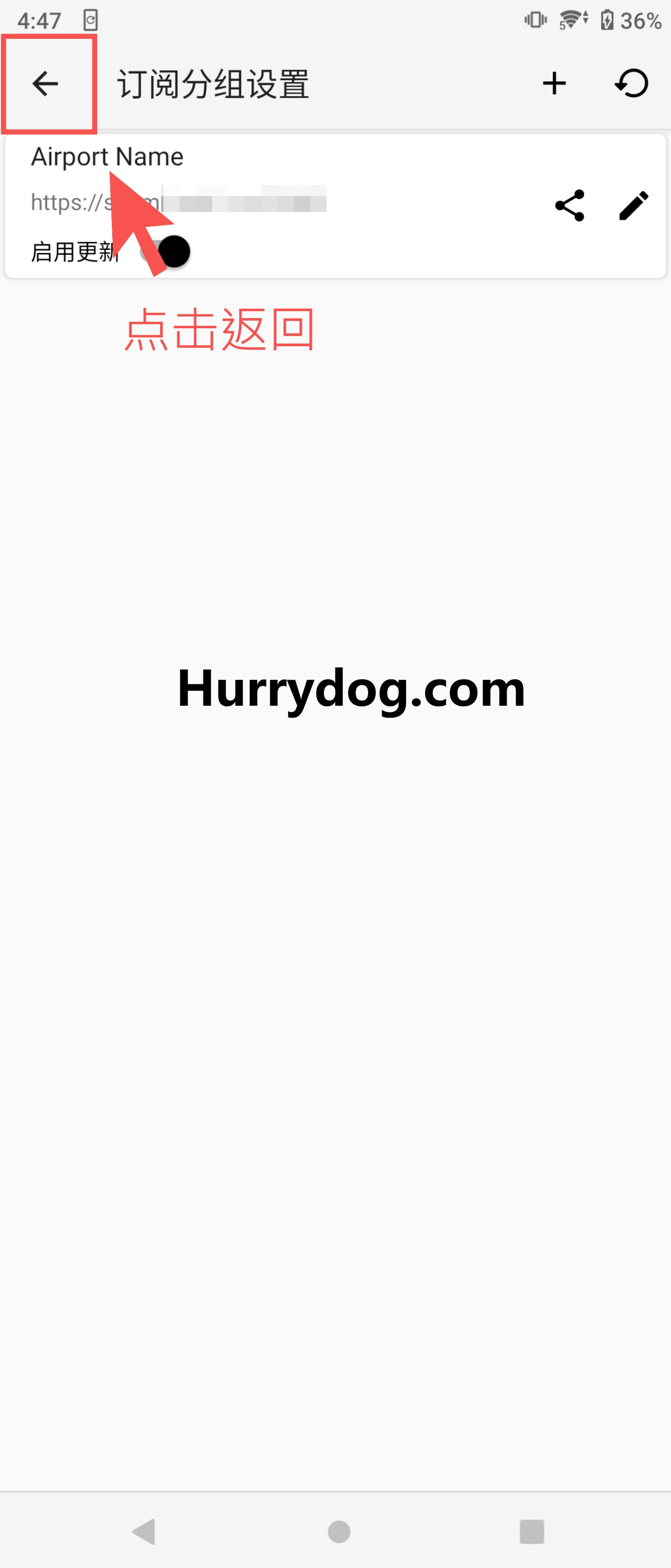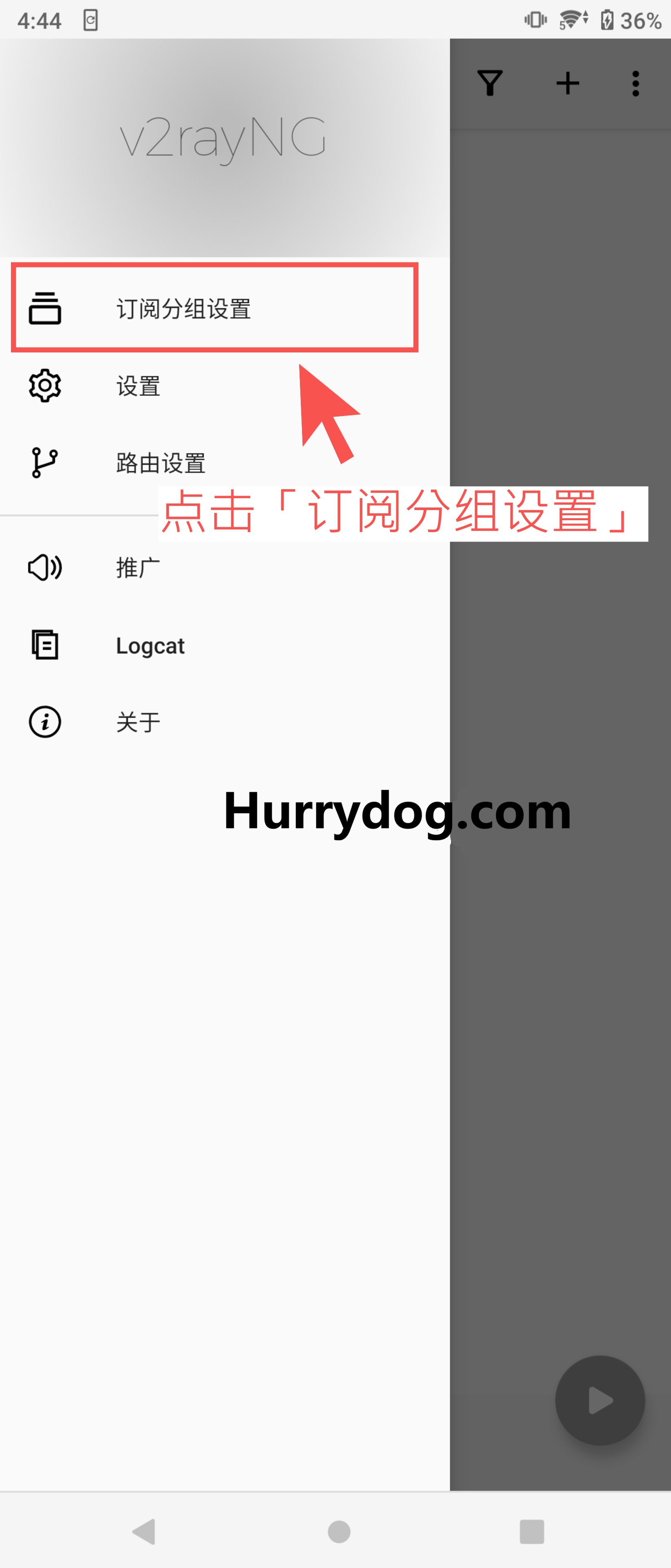 导入订阅地址:在v2rayNG客户端中,点击左上角三条横杆图标,依照下图步骤导入订阅地址。
