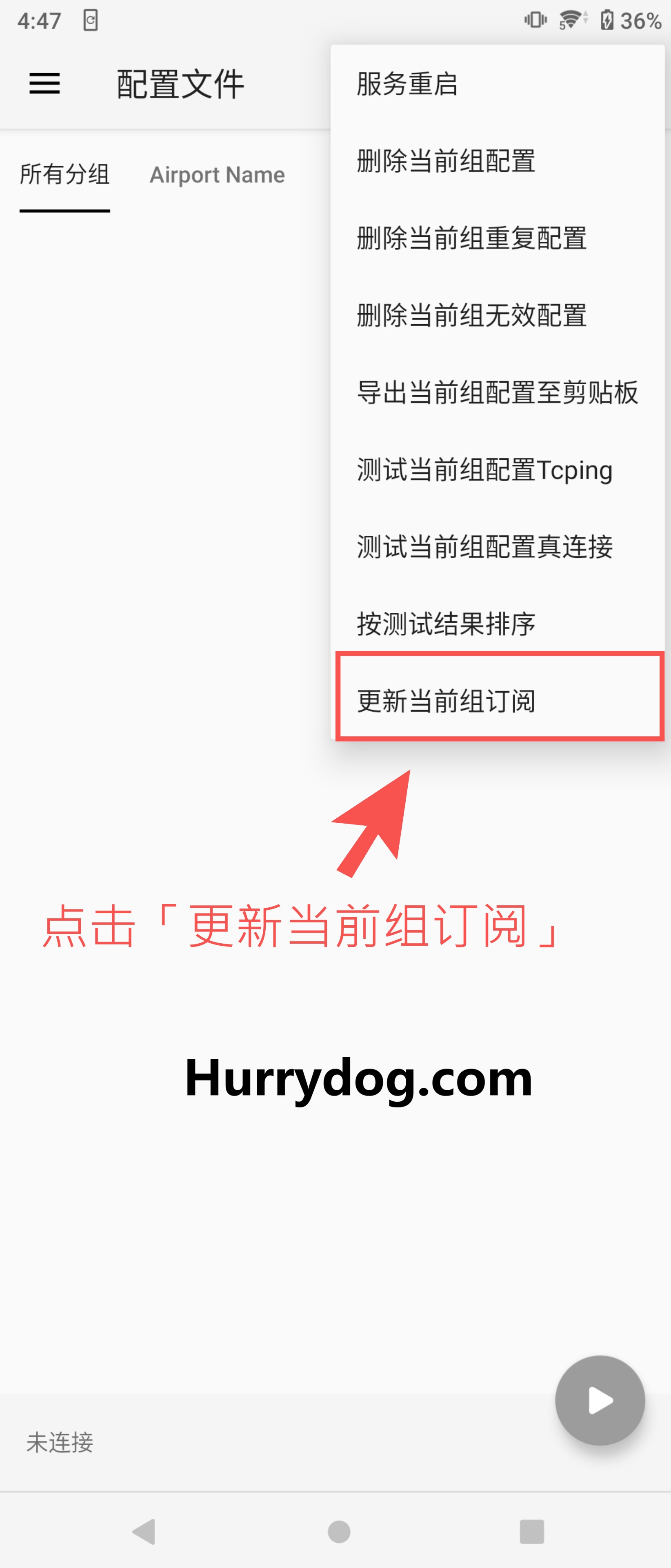 更新节点信息:返回首页,点击右上角三个点,选择「更新当前组订阅」以同步节点信息。