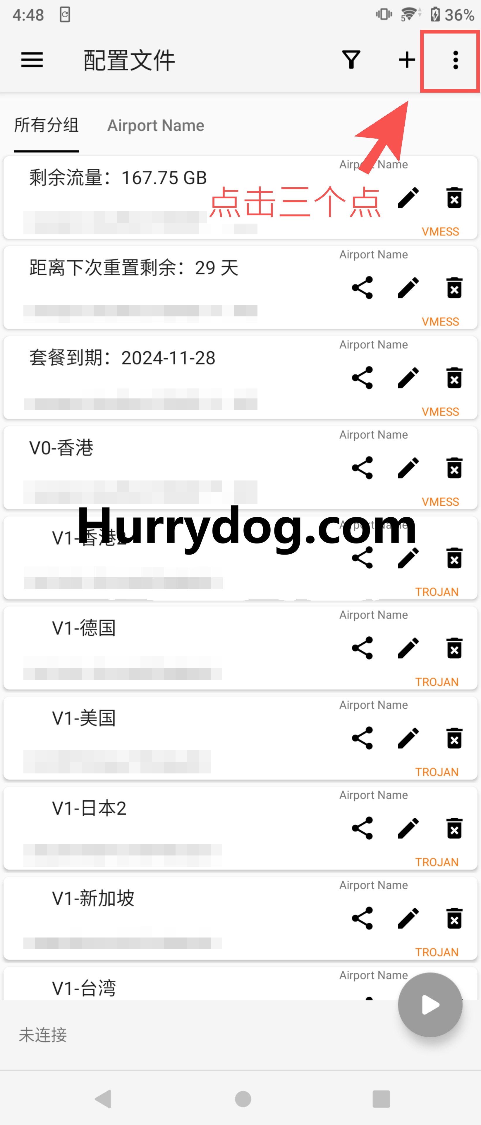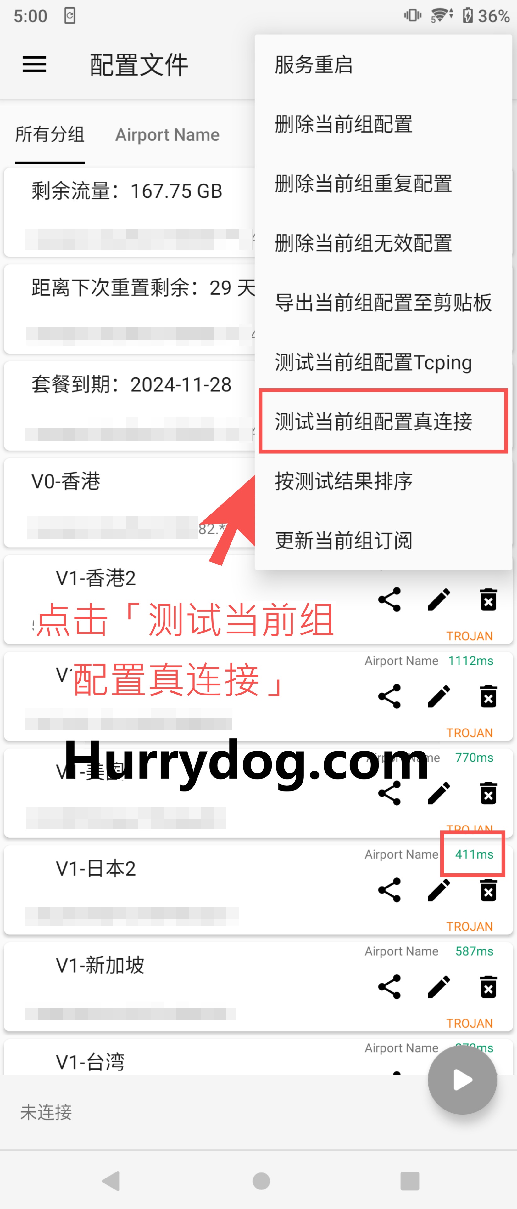 测试节点连通性:点击右上角三个点,选择「测试当前组配置真连接」。绿色数字表示节点正常,-1表示节点不通,此时需调整节点设置或联系机场客服。