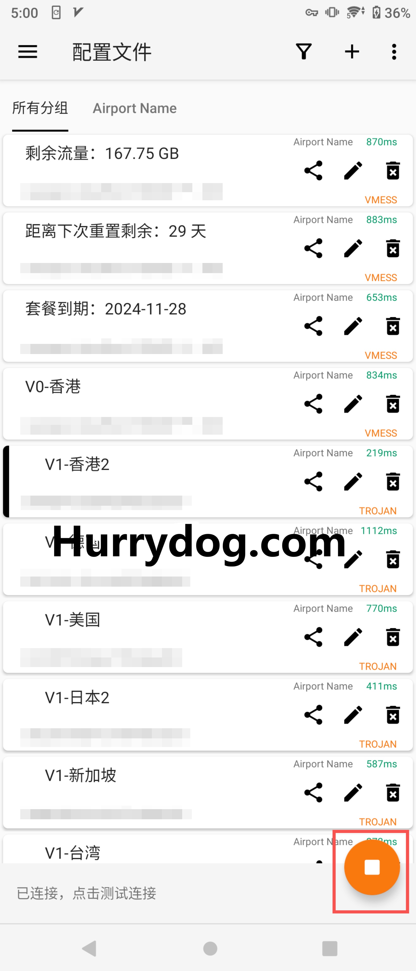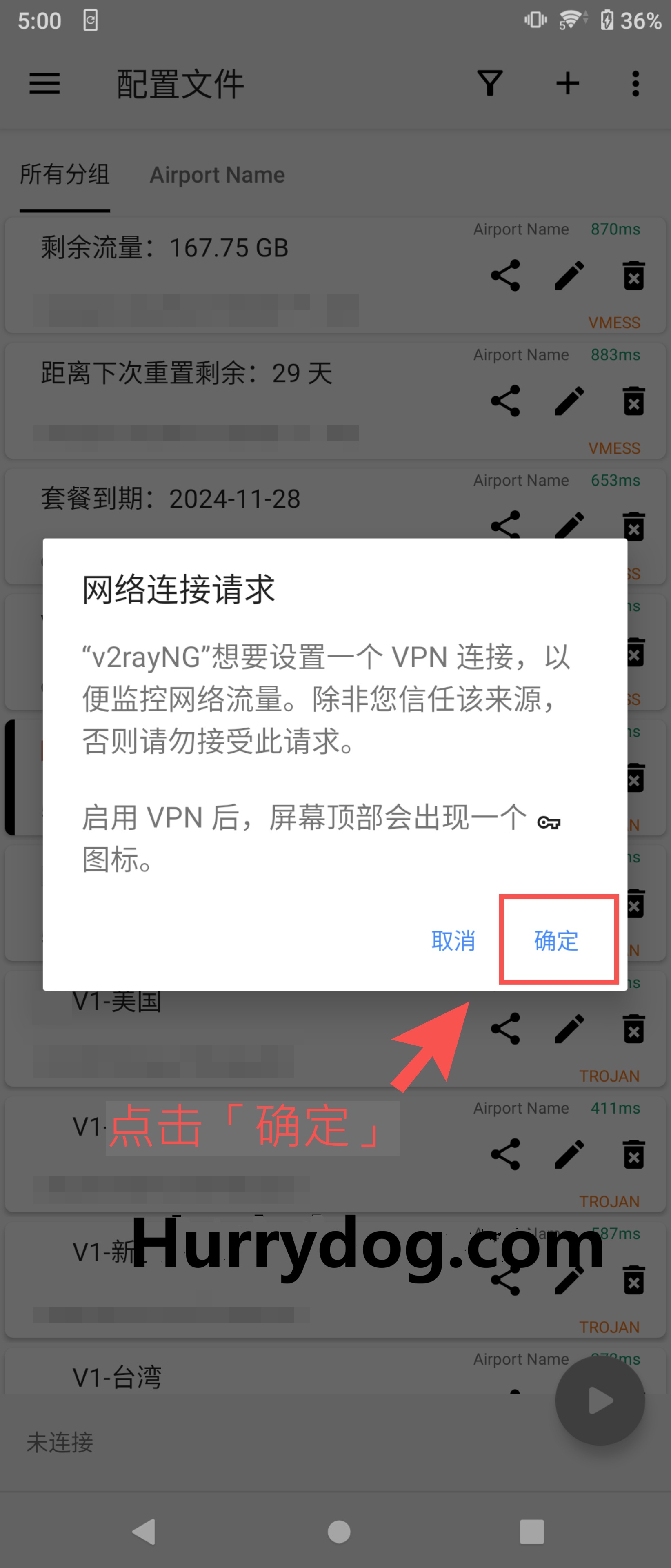 首次连接时,系统会弹出提示,询问是否允许VPN连接,点击「确定」即可完成v2rayNG的代理连接。连接成功后,右下角的按钮会变成橙色方块。如果想关闭v2rayNG的代理,只需再次点击右下角的橙色方块即可关闭代理。