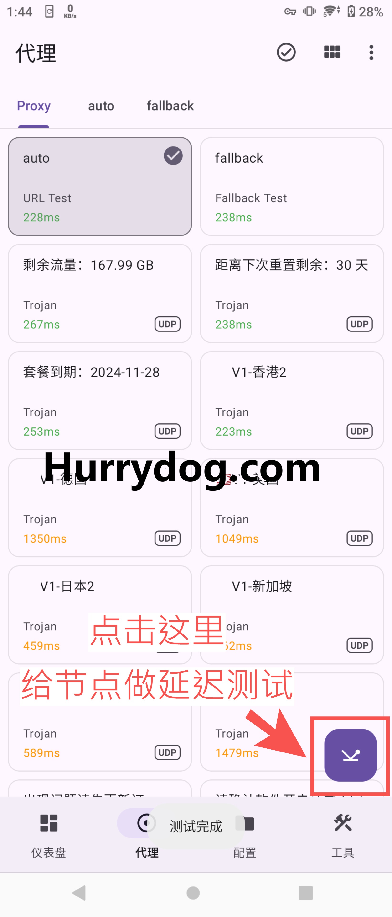 进入「代理」菜单,进行节点延迟测试。显示正常数字的节点可用,不显示数字的节点可能存在问题,需联系机场主进行排查。