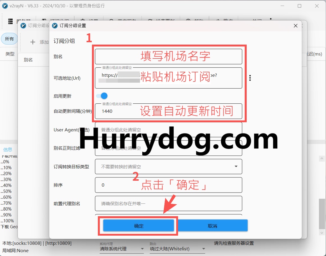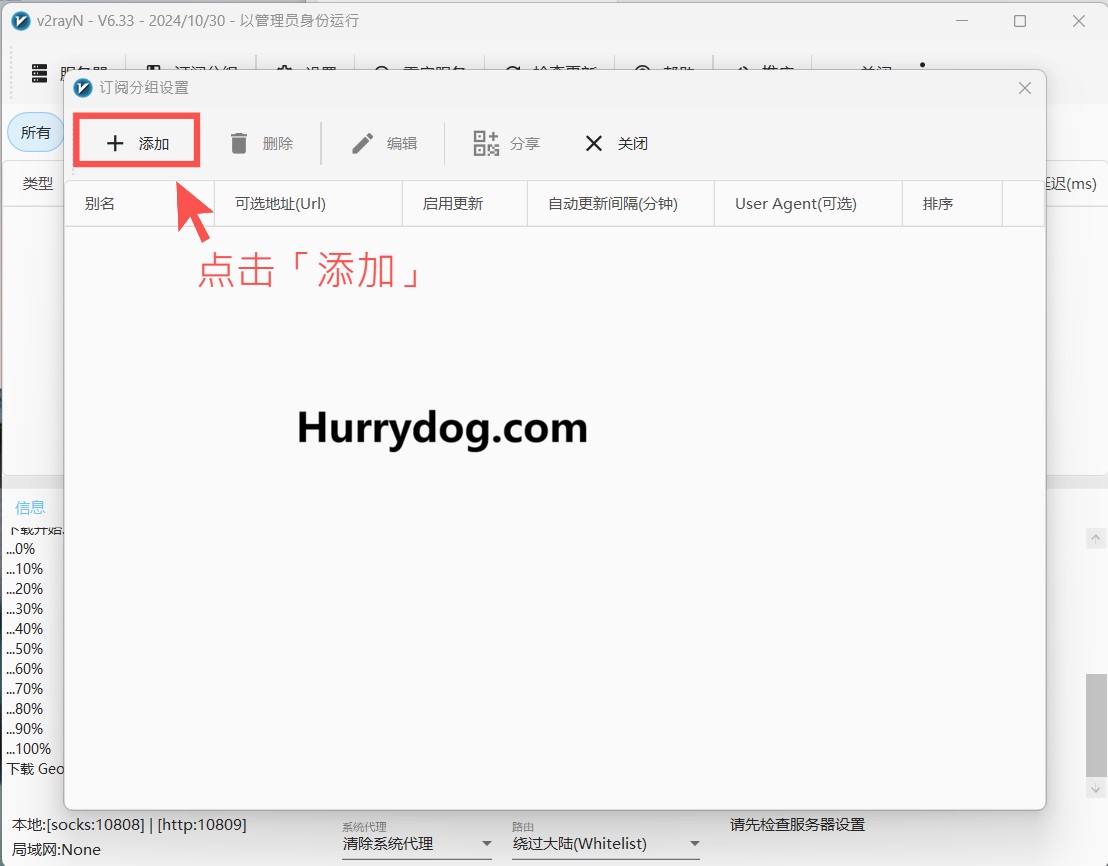 打开v2rayN,点击「订阅分组」→「订阅分组设置」→「添加」,输入你的订阅链接并进行设置。