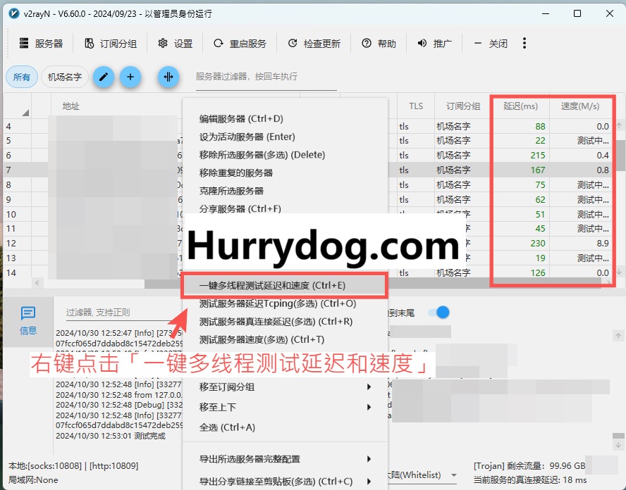 在主界面上,检查机场节点的延迟和速度。如果当前可用,延迟和速度后面会显示数字;如果显示-1,则表示该节点不可用,请联系机场官方解决。可以全选节点,右键点击「一键多线程测试延迟和速度」,或使用V2rayN的快捷键进行测试。
