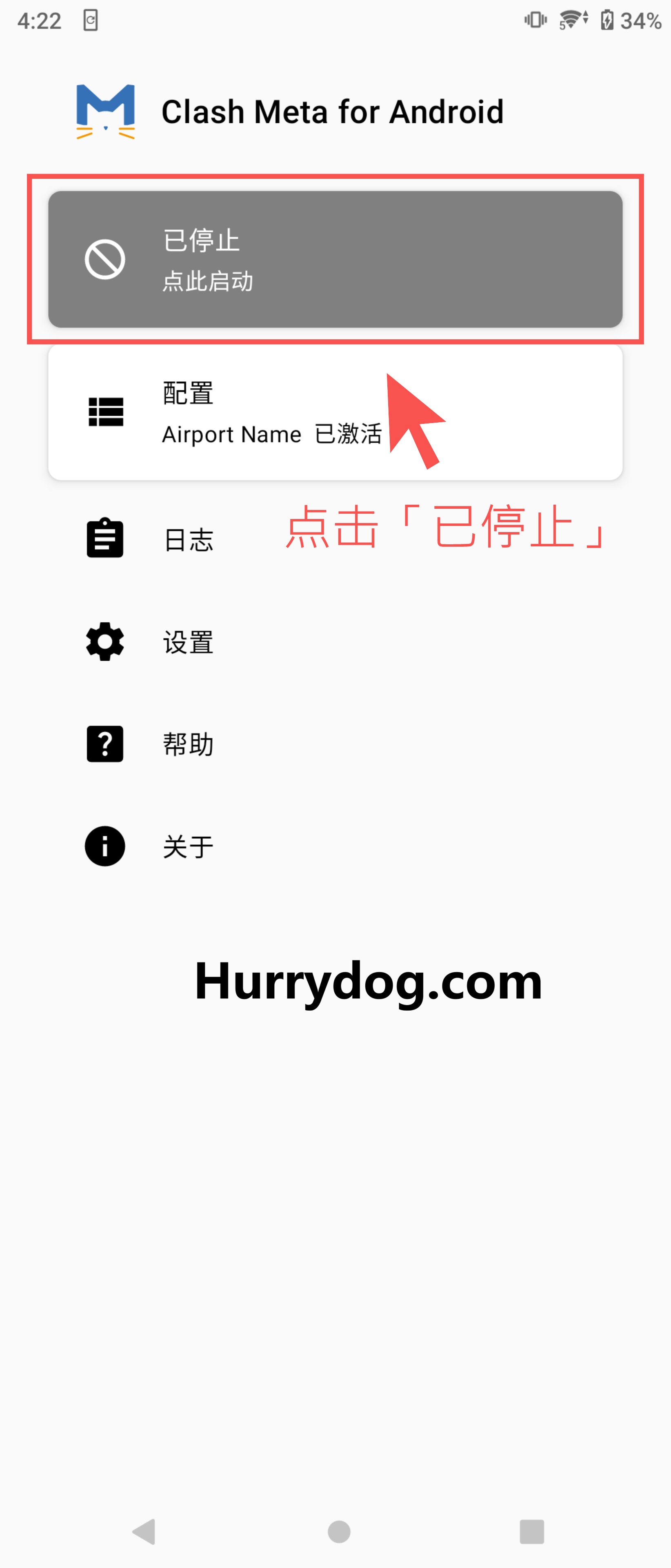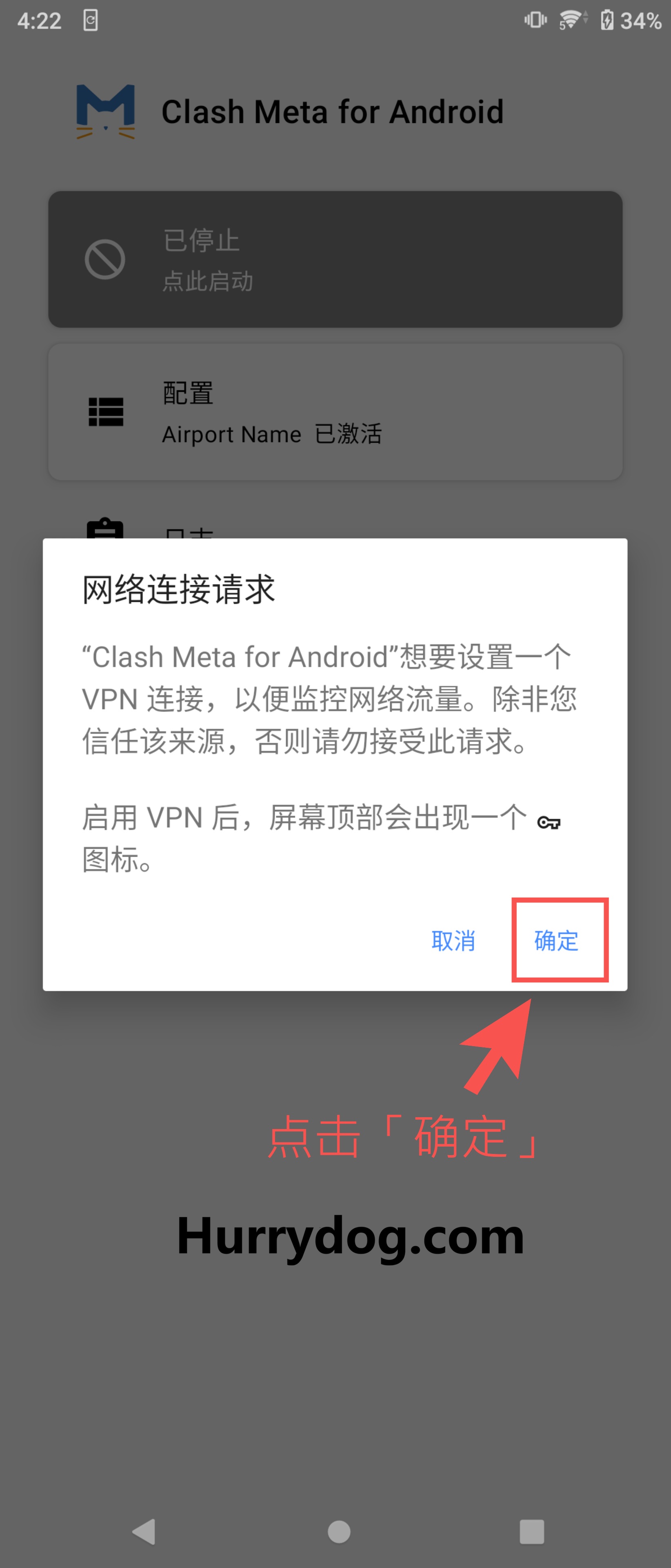 选中配置文件,然后点击「已停止」,确认启动VPN。