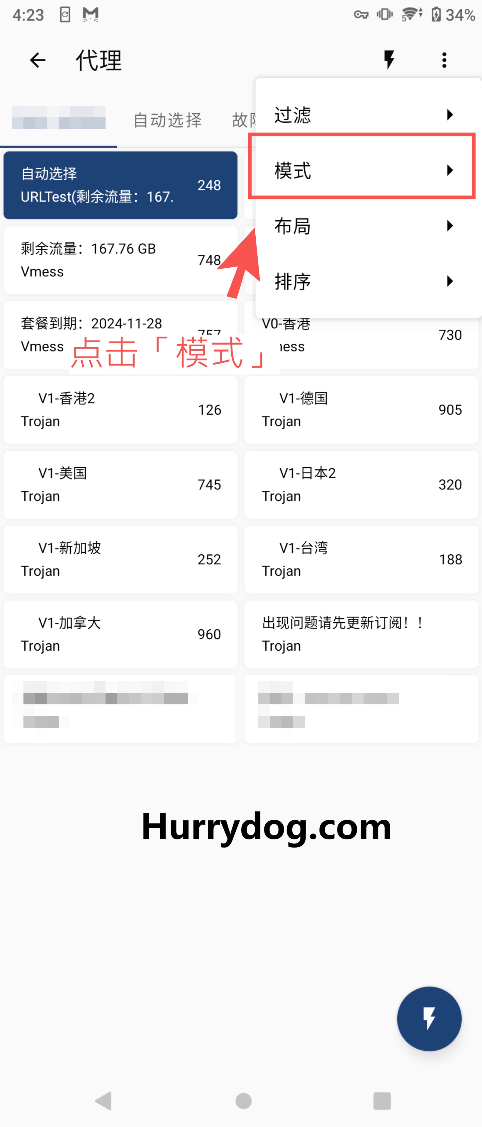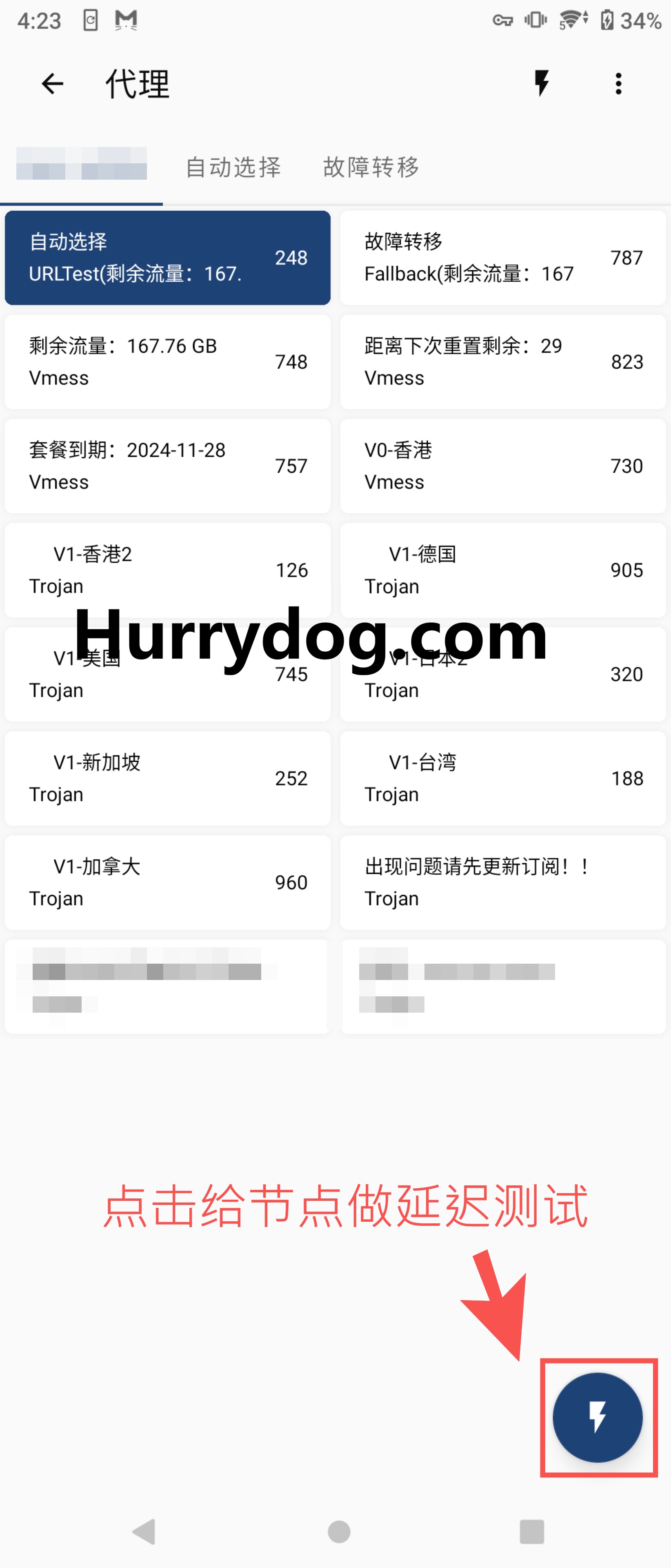 点击【代理】进行节点延迟测试。如果延迟数字不显示,可能是节点或网络问题;如果显示数字,则节点正常。